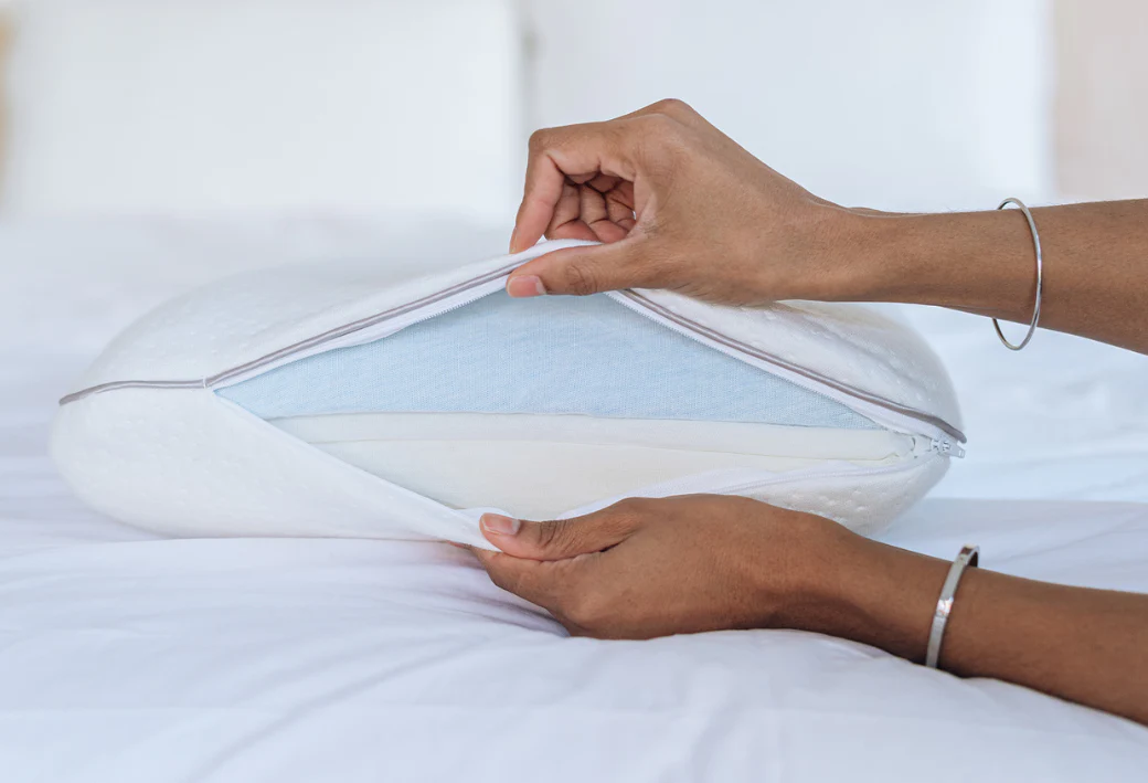 A almofada Ergonómica é uma almofada 3 em 1 com memória de forma e camadas de espumas amovíveis para adaptar o apoio e a altura em função da sua morfologia e posição de sono (de costas, de lado, de barriga para baixo). Combina a espuma com memória de forma e a espuma infundida com gel refrescante para reduzir os pontos de pressão, regular a temperatura e melhorar o conforto durante a noite. A capa em fibras de bambu é respirável, hipoalergénica e possui a certificação STANDARD 100 by OEKO-TEX® para um sono mais saudável. Fácil de lavar e concebida para durar, transforma o seu descanso personalizado sem dores de cabeça.
