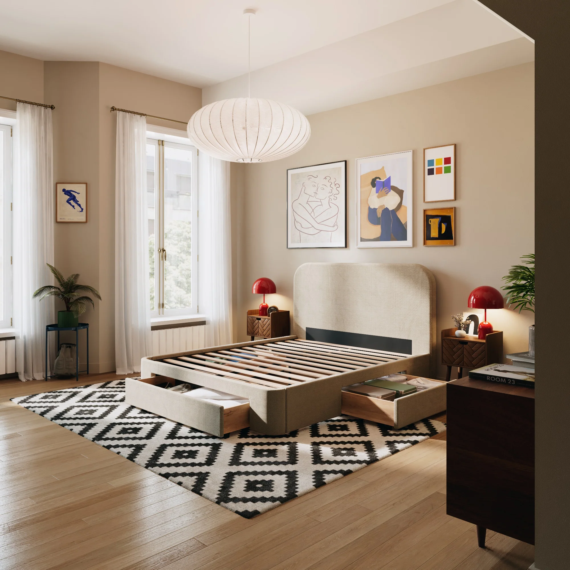 - Cabecero redondeado y dos configuraciones de cajones a elegir